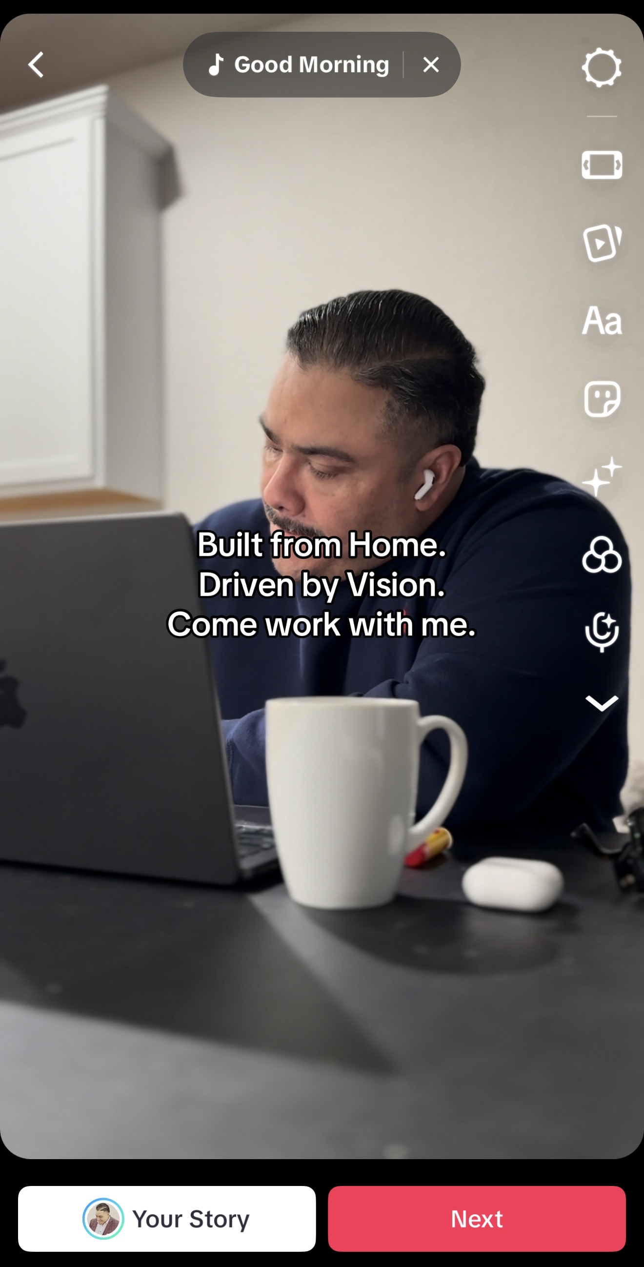 I went back to ChatGPT and typed in: I used the on screen text of "build from home. Driven by vision. Come work with me." Give me a caption.