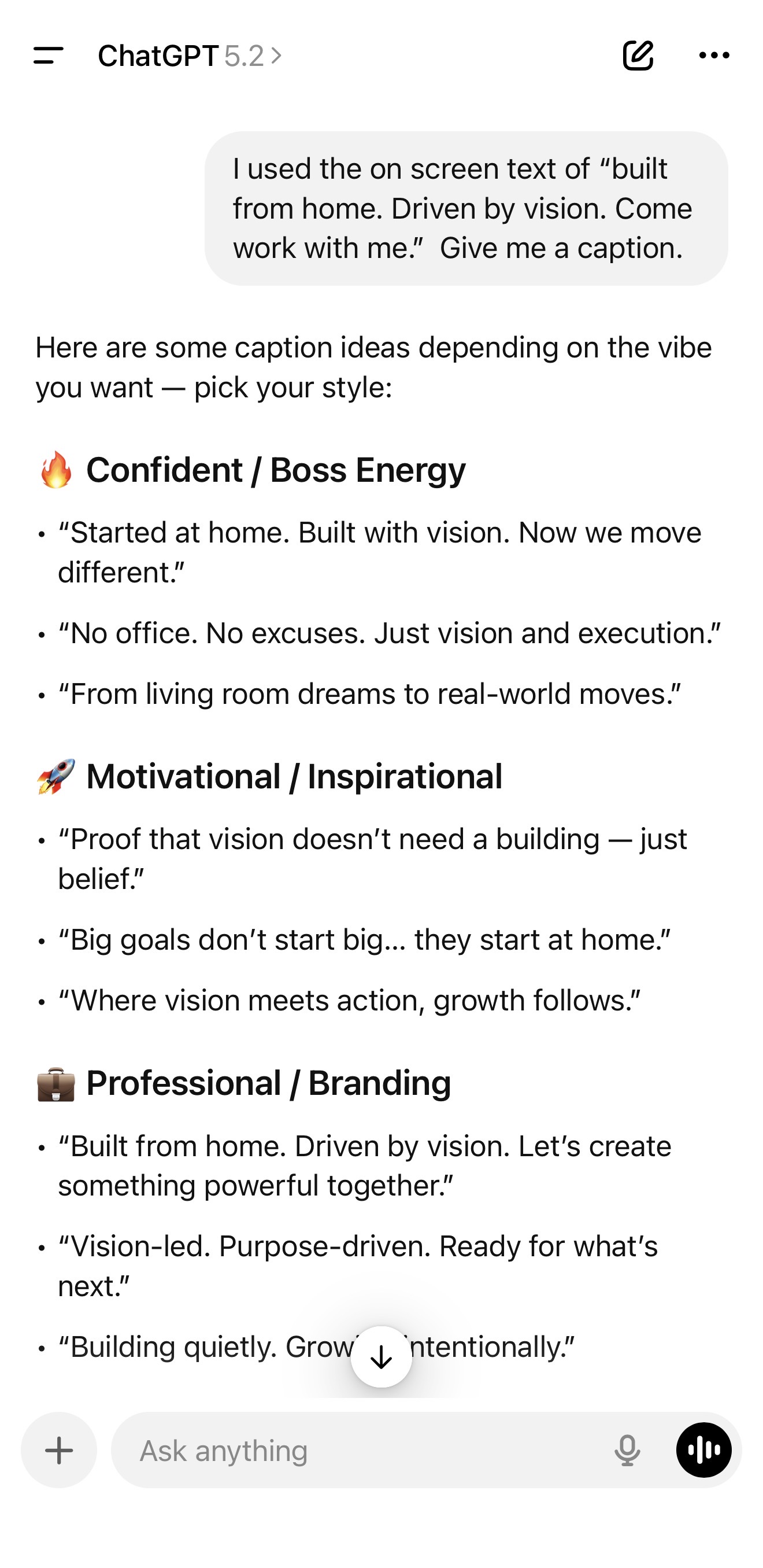 Go back to CHATGPT and enter prompts such as: I used this, "________" (copy/paste the onscreen text you used), as my on-screen text. What should I use for my caption?