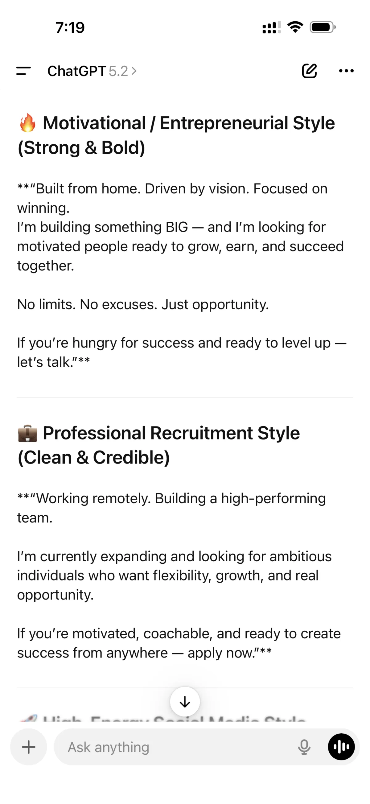 I literally went to ChatGPT and typed in: "give me an on-screen text for a guy that is working from home wanting to succeed big and is hiring."